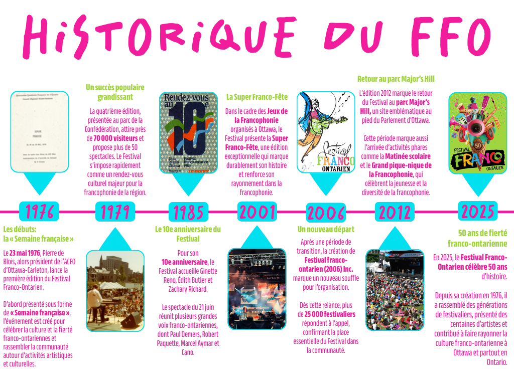 Le Festival Franco-Ontarien, créé le 23 mai 1976 par Pierre de Blois, alors président de l’ACFO d’Ottawa-Carleton, s’est rapidement imposé comme un pilier de la francophonie en Ontario et une véritable vitrine de la culture francophone. L’an dernier, le Festival a franchi le cap symbolique de son 50e anniversaire, célébré en grandes pompes, confirmant plus que jamais la fierté et la vitalité de la communauté franco-ontarienne.